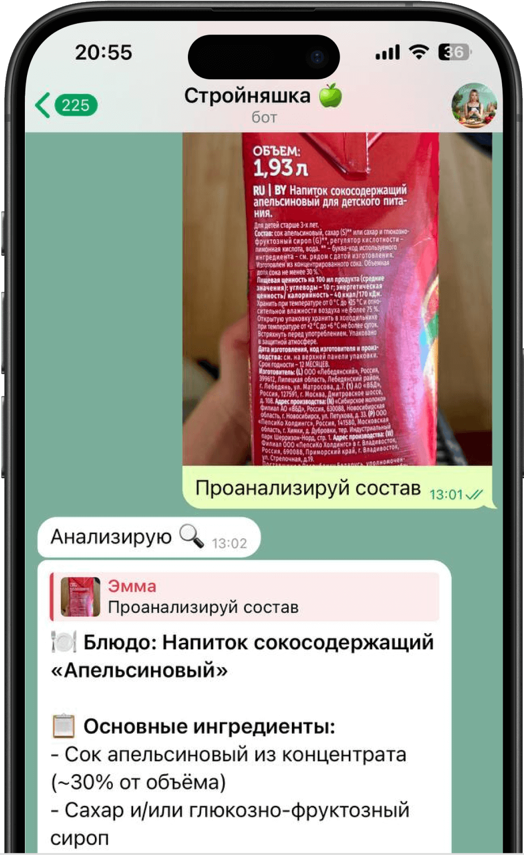 Бот с умным ИИ понимает не только, что на тарелке, но и что в ваших анализах. Он подсказывает по питанию, тренировкам, восстановлению и общему самочувствию. Вы просто задаёте вопрос — он отвечает по делу. Без диет, стресса и сложных терминов.