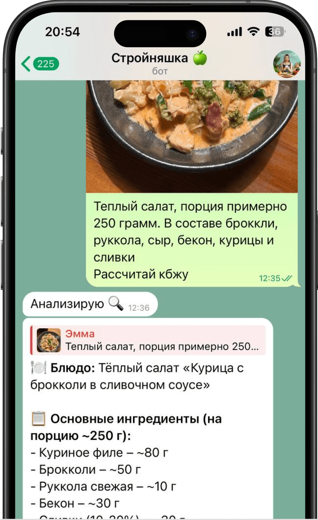 И не придется! Сфотографировали тарелку — бот посчитал всё за вас. Никаких весов и калькуляторов.