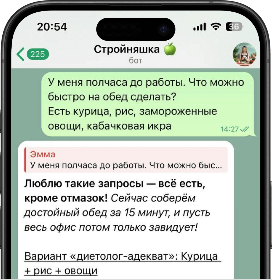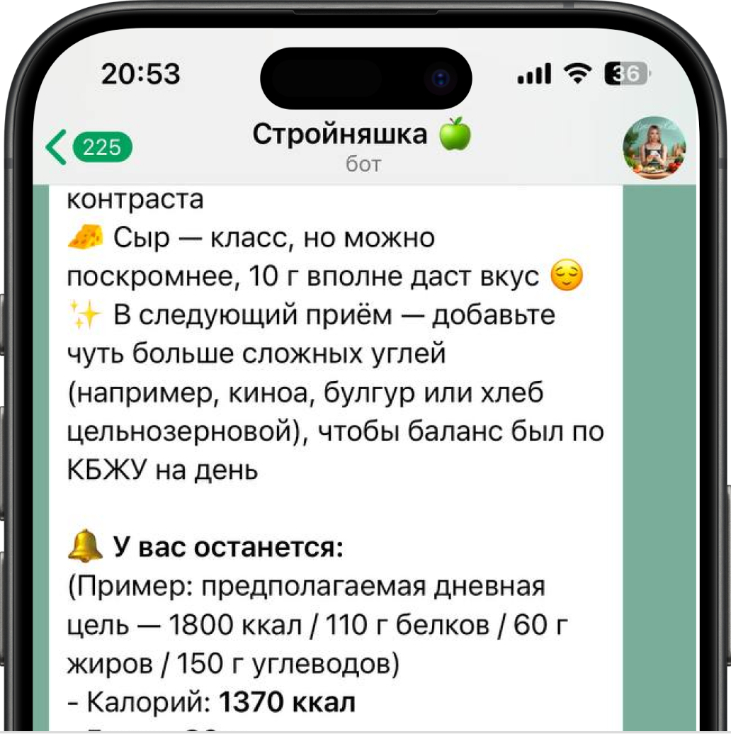 Наш бот — не фанатик экстремальных диет. Он работает по проверенным научным методикам и никогда не предложит опасные советы. А если заметит что-то настораживающее в ваших данных, честно скажет обратиться к врачу.