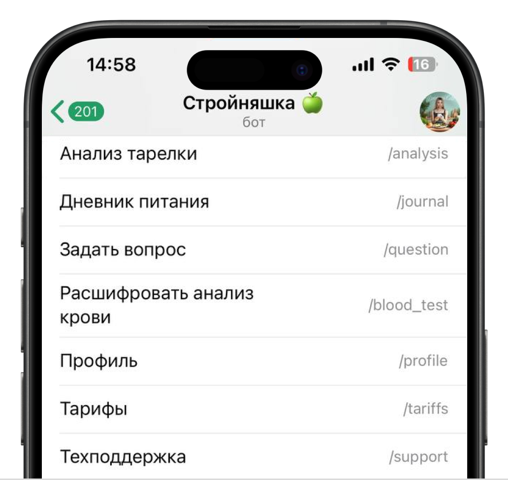 Перед стартом вы заполняете анкету о здоровье и пищевых привычках. Бот настраивается точно под вас — ваш личный нутрициолог в кармане.